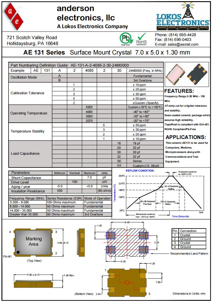 AE-131-A-2-4085-3-20-24M0000|Anderson Crystals,Anderson晶振,AE-131無源晶振,石英晶體諧振器,AE-131-A-2-4085-3-20-24M0000晶振,進口晶振,7050mm晶振,四腳貼片晶振,SMD晶振,頻率24MHz,負載20pF,工作溫度-40~85°C,頻率容差20pm,高穩(wěn)定性晶振,無鉛環(huán)保晶振,低老化晶振,調(diào)制解調(diào)器晶振,微處理器晶振,計算機晶振,通信設(shè)備晶振.