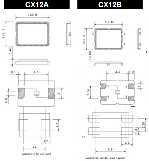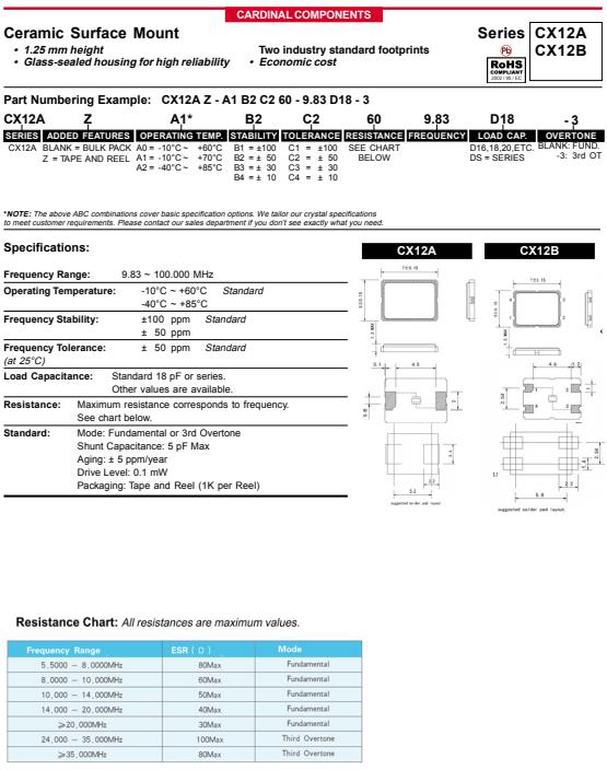 更多>>美國卡迪納爾晶振,CX12A/CX12B無源貼片晶振,CX12AZ-A2-B3C360-9.83D20-3晶振