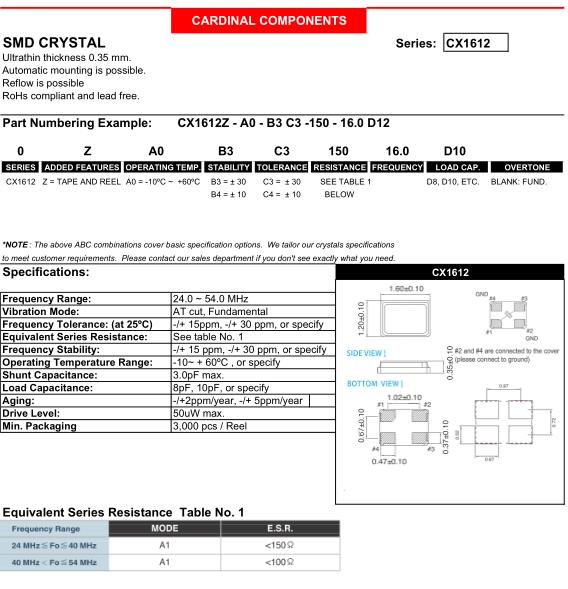 更多>>美國Cardinal貼片晶振,CX1612小體積晶振,CX1612Z-A0B4C4-150-16.0D12晶振