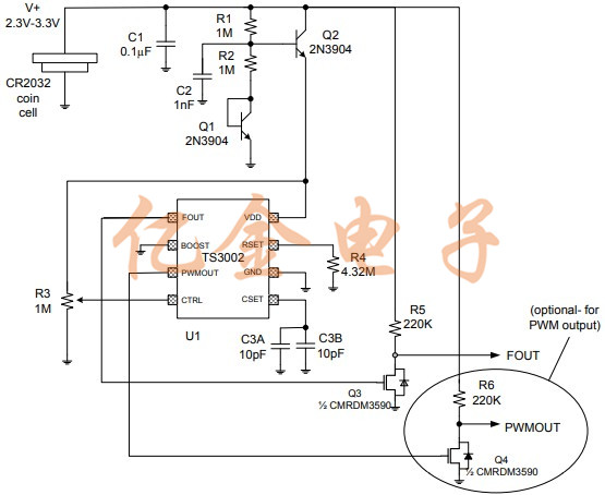 在下面的電路中,Q2從較高的V+電壓降低電壓,以降低的電壓為TS3002振蕩器提供電源.的Q1的VBE電壓為Q2的VBE提供補(bǔ)償電壓,從而提供一些溫度跟蹤.可以更改值R1和R2以針對(duì)其他V+電壓范圍優(yōu)化設(shè)計(jì),如表1所示.