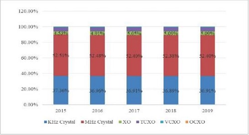 無源晶振產(chǎn)銷量在石英晶振市場(chǎng)中占較大份額.根據(jù)CS&A數(shù)據(jù),2018年全球利用石英晶體制成的頻率元件產(chǎn)值為33億美元,其中無源產(chǎn)品產(chǎn)值為18億美元,占比為55.3%.石英晶體頻率元件年銷量180億顆,其中無源產(chǎn)品銷量為164.45億顆,占比為89.3%.