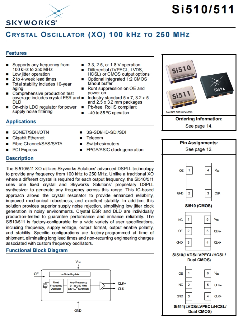 510BBA125M000BAG | Skyworks | Si510 | XO | 125 MHz | LVDS | 3.3V | ±25ppm |