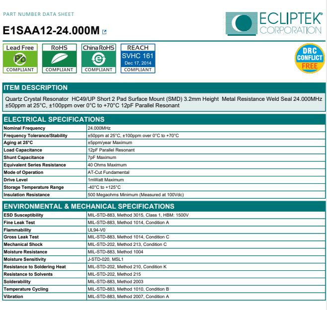 E1SAA24-6.000M | AT-Cut Fundamental | SMD HC-49/UP Short | ±100ppm | 0°C to +70°C | ±5ppm | 7pF Maximum |