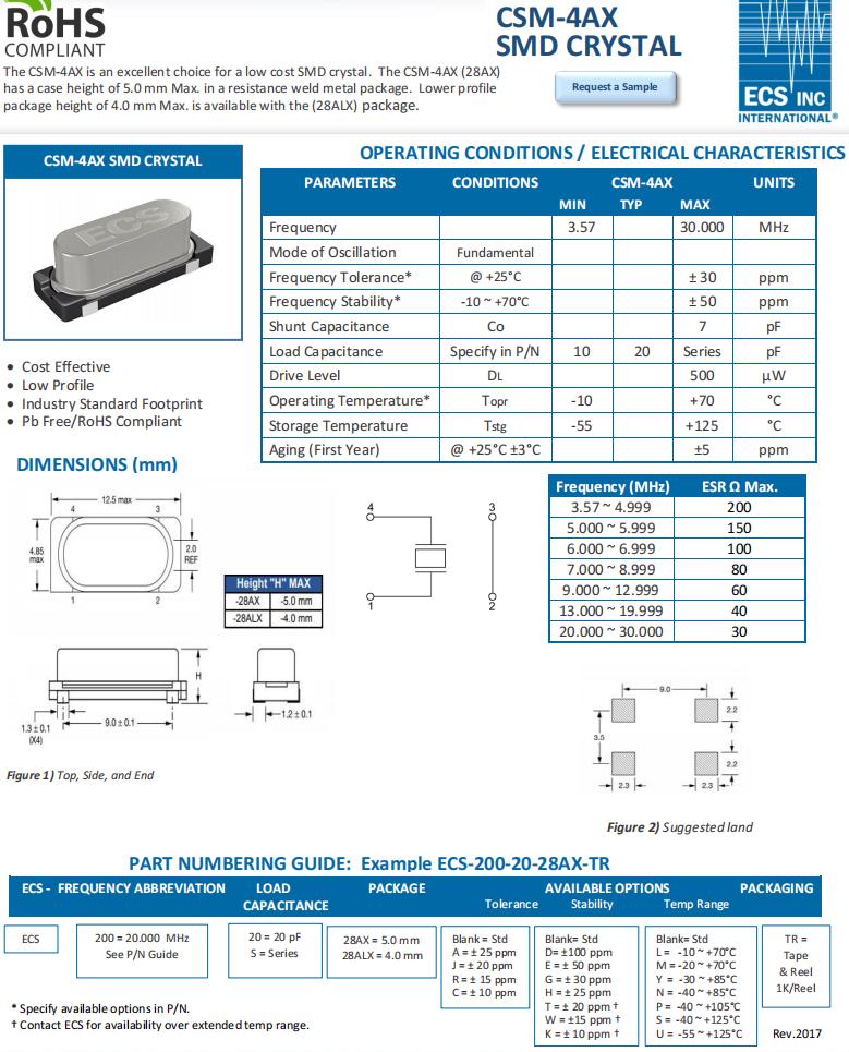 ECS-40-20-28AX-TR | ECS晶振 | CSM-4AX | 4MHz | -10°C ~ 70°C |