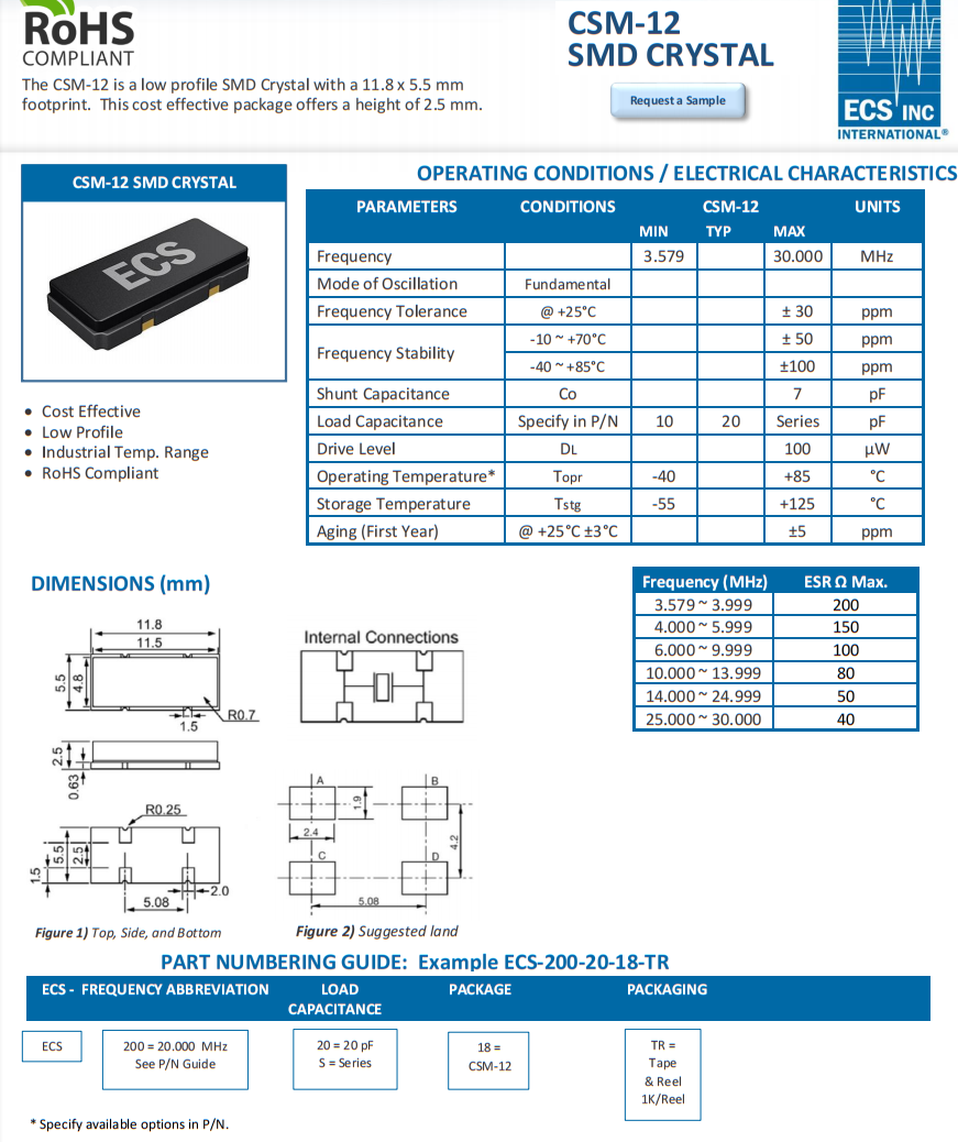 ECS-40-20-18-TR | CSM-12 | MHz Crystal | 4MHz | ±100ppm | ±30ppm | 20pF |