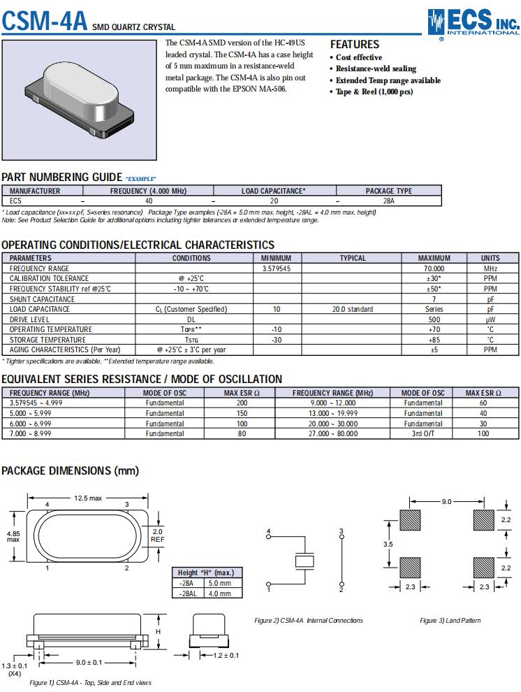 ECS-40-20-28A-TR | ECS晶振 | CSM-4A | 4MHz | -10°C ~ 70°C |