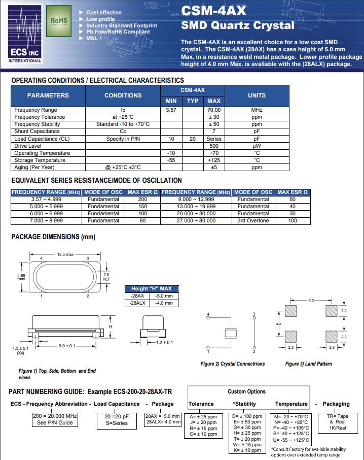 ECS-40-20-28AX-TR | CSM-4AX | MHz Crystal | 4MHz | ±50ppm | ±30ppm | 20pF |