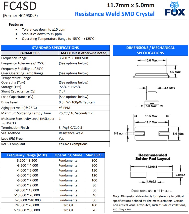 FC4SDCBMM4.0-T1 | Fox晶振 | FC4SD | 4 MHz | ±50ppm |