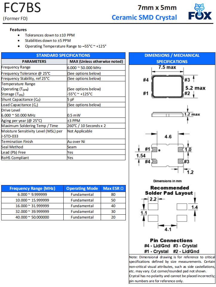 FC7BSCCMC10.0-T1,7050mm無(wú)源晶振,FOX晶體諧振器,智能家居晶振,規(guī)格表