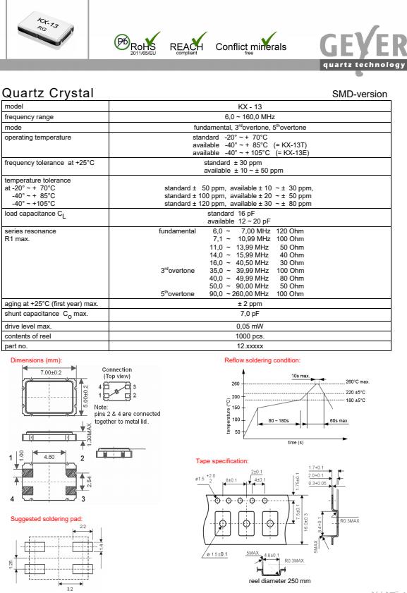 GEYER高性能晶振,KX-13無源晶振,7050mm貼片晶振, 石英貼片晶振本身體積小,超薄型石英晶體振蕩器,特別適用于有目前高速發(fā)展的高端電子數(shù)碼產(chǎn)品,因為晶振本身小型化需求的市場領(lǐng)域,小型,薄型是對應(yīng)陶瓷振蕩器(偏差大)和普通的石英晶體振蕩器(偏差小)的中間領(lǐng)域的一種性價比較出色的產(chǎn)品.產(chǎn)品廣泛用于筆記本電腦,無線電話,衛(wèi)星導(dǎo)航SSD,USB,Blu-ray等用途,符合無鉛焊接的高溫回流焊曲線特性.