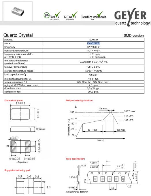 GEYER晶振,KX–327FT無源晶體,32.768K晶振,貼片表晶32.768K系列千赫晶體KHZ具有超小型,薄型,質(zhì)地輕的表面貼片音叉型石英晶體振蕩器,晶振產(chǎn)品本身具備優(yōu)良的耐熱性,耐環(huán)境特性,在辦公自動化,家電領(lǐng)域,移動通信領(lǐng)域可發(fā)揮優(yōu)良的電氣特性,符合無鉛標準,滿足無鉛焊接的回流溫度曲線要求,金屬外殼的石英晶振使得產(chǎn)品在封裝時能發(fā)揮比陶瓷晶振外殼更好的耐沖擊性能.