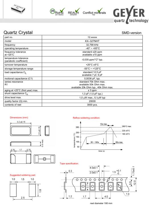 GEYER格耶晶振,KX-327NHT兩腳晶振,SMD晶振,32.768K時鐘晶體具有小型,薄型,輕型的貼片晶振,,貼片型表面音叉型晶體振蕩器,產(chǎn)品具有優(yōu)良的耐熱性,耐環(huán)境特性,可發(fā)揮晶振優(yōu)良的電氣特性,符合RoHS規(guī)定,滿足無鉛焊接的高溫回流溫度曲線要求,金屬外殼的封裝使得產(chǎn)品在封裝時能發(fā)揮比陶瓷振蕩器外殼更好的耐沖擊性.