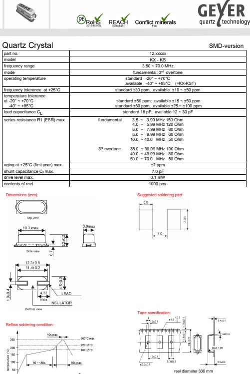 GEYER晶振,KX-KS低損耗晶振,無源貼片晶振,普通貼片石英晶振外觀使用金屬材料封裝的,具有高穩(wěn)定性,高可靠性的石英晶體振蕩器,晶振外觀本身使用金屬封裝,充分的密封性能,可確保其高可靠性,采用編帶包裝,外包裝采用朔膠盤,可在自動貼片機上對應自動貼裝等優(yōu)勢.
