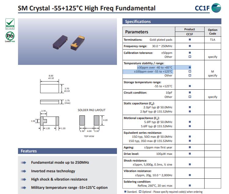 頻率溫度特征 | f_tem | ±30ppm over -40 to +85°C ±100ppm over -55 to +125°C | 超出標(biāo)準(zhǔn)的規(guī)格請(qǐng)聯(lián)系我們. | |