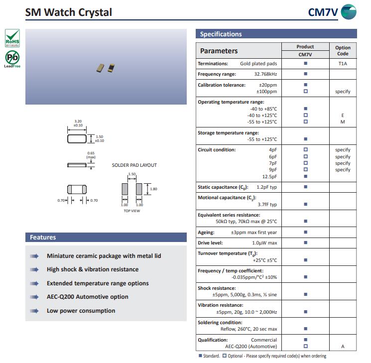 高利奇晶振,CM7V晶振,32.768K晶振此款SMD晶體并且可以承受回流焊接的高溫,波峰焊接,回流焊接等,貼片表晶主要特點是該產品排帶包裝,焊接模式主要使用SMT焊接,給現(xiàn)代SMT工藝帶來高速的工作效率,32.768K系列產品本身具有體積小,厚度薄,重量輕等特點,此音叉型石英晶體諧振器,晶振產品本身具備優(yōu)良的耐熱性,耐環(huán)境特性,在辦公自動化,家電領域,移動通信領域可發(fā)揮優(yōu)良的電氣特性,符合無鉛標準,滿足無鉛焊接的回流溫度曲線要求,金屬外殼的石英晶振使得產品在封裝時能發(fā)揮比陶瓷晶振外殼更好的耐沖擊性能.