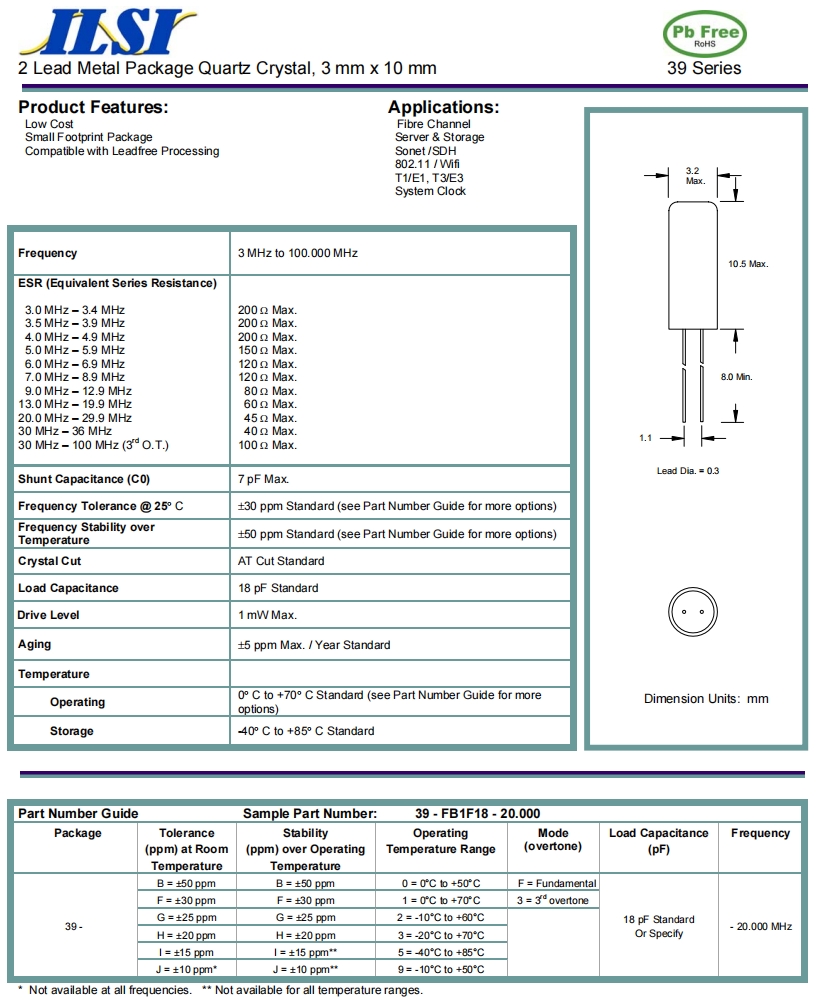ILCX13-JH5F8-39.000 MHz | ILSI | ILCX13 | -40°C ~ 85°C | 39 MHz | ±10ppm | 8 pF |