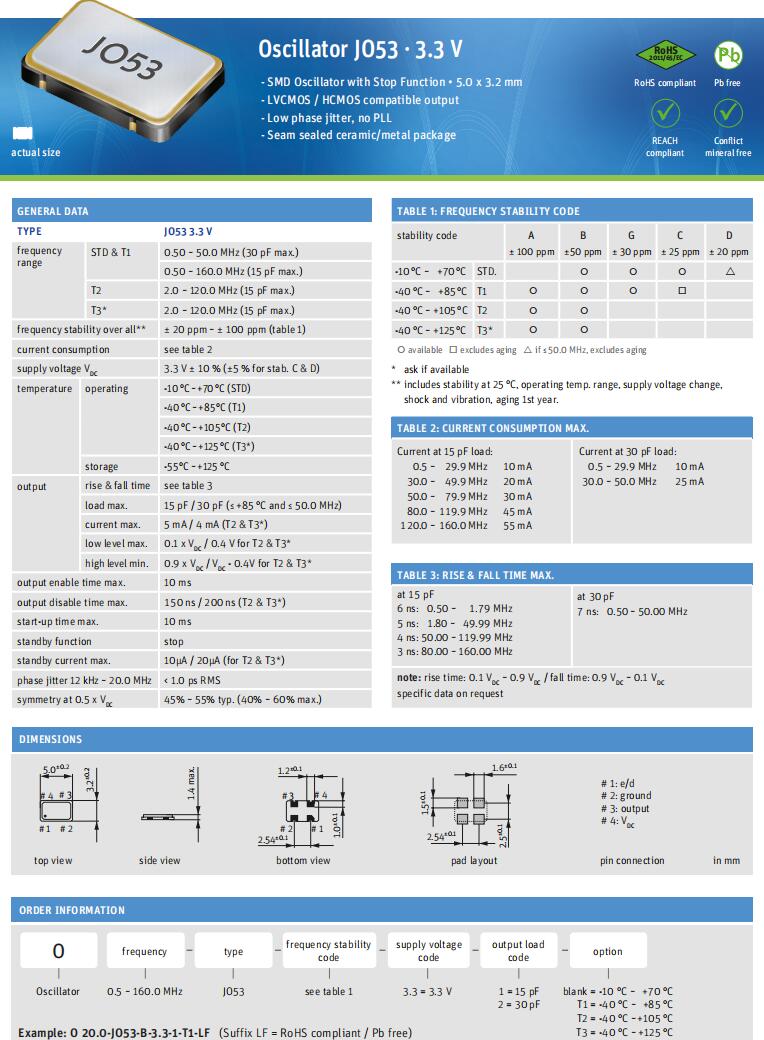 Jauch晶振,O 12.0-JO53-B-3.3-2-T1-LF,6G信號(hào)接收器晶振規(guī)格表