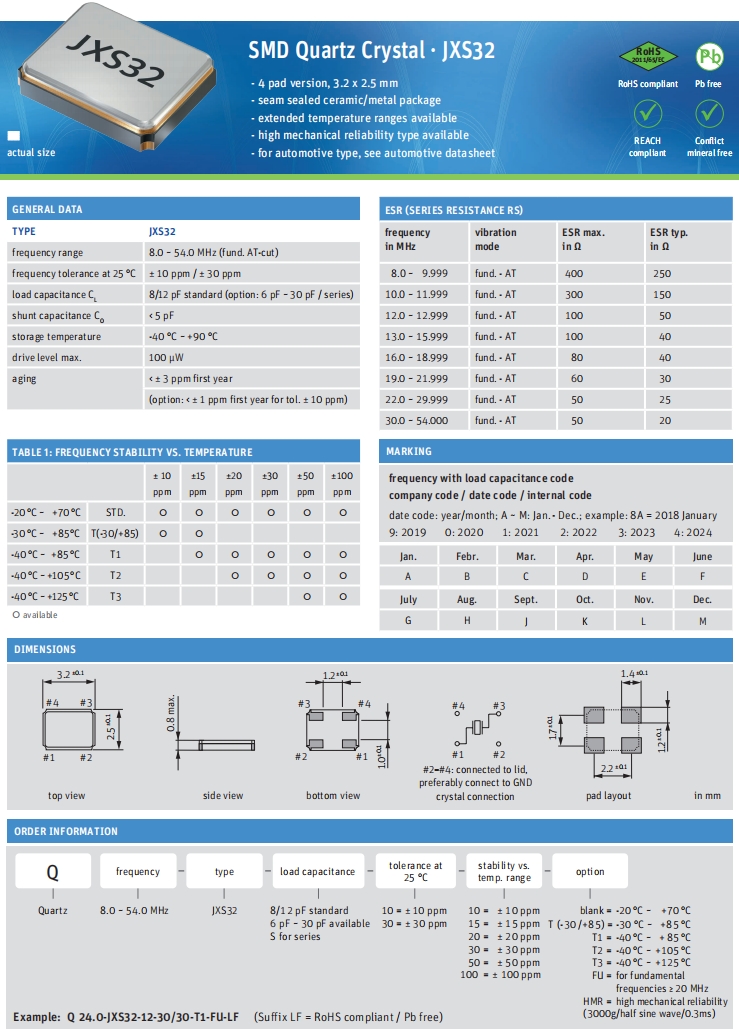 Q 24.0-JXS22-10-10/10-FU-WA-LF | Jauch晶振 | JXS22-WA | 24MHz | ±10ppm | 10pF | -20°C ~ 70°C |