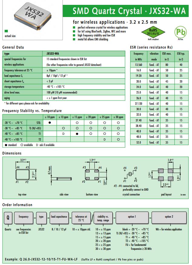 Q 32.0-JXS32-12-10/10-FU-WA-LF 3225 32MHz 12PF 10PPM,歐美進(jìn)口晶振,接縫密封陶瓷/金屬封裝,擴(kuò)展溫度范圍可用,高機(jī)械可靠性類型可用,用于汽車類型,見汽車數(shù)據(jù)表
