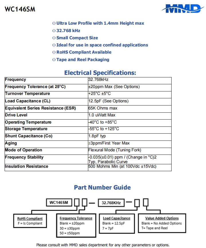 麥迪康進(jìn)口晶振,WC146SMF-32.768KHZ-T,6G基站晶振規(guī)格表