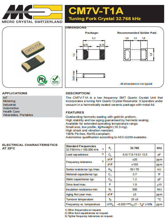 CM7V-T1A-32.768kHz-12.5pF-100PPM-TA-QC | Micro Crystal | 晶體 32.768 kHz 12.5 pF +/-100 PPM -40/+85C |