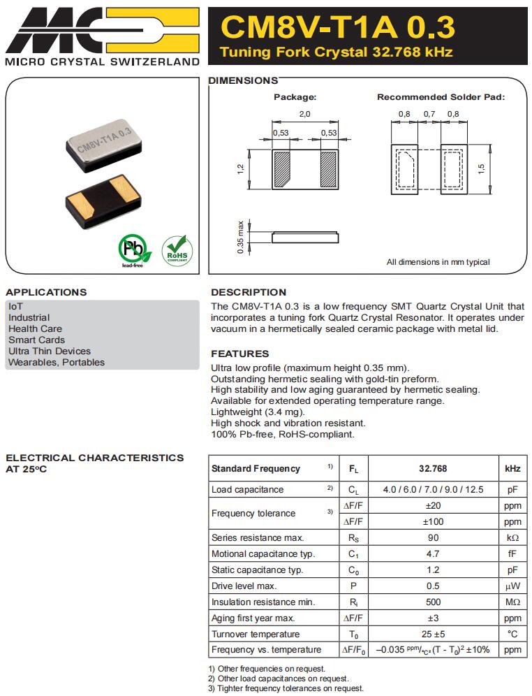 CC1V-T1A-32.768kHz-12.5pF-30PPM-TA-QC | Micro Crystal | 晶體 32.768 kHz 12.5 pF +/-30 PPM -40/+85C |