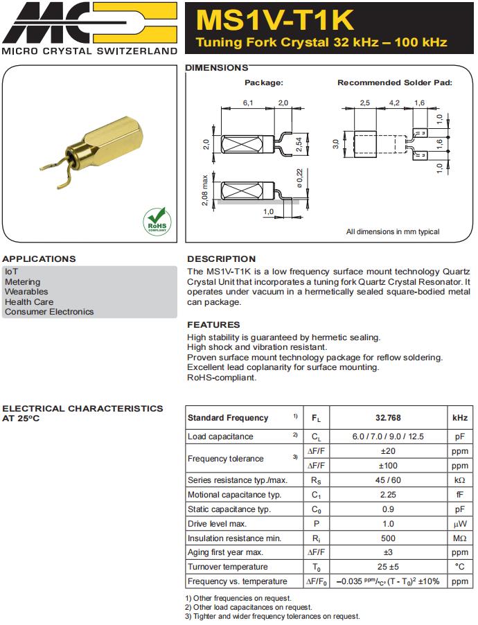 MS1V-T1K-32.768kHz-12.5pF-10PPM-TA-QC-Au | Micro Crystal | 晶體 32.768 kHz 12.5 pF +/-10 PPM -40/+85C |