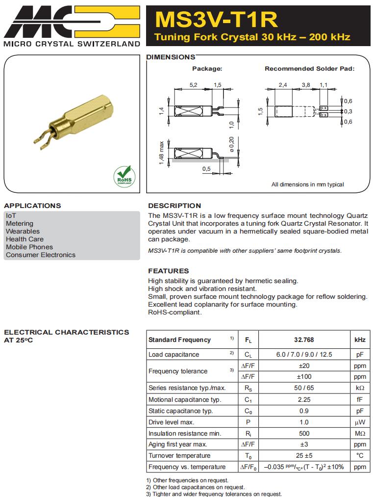 MS1V-T1K-32.768kHz-12.5pF-10PPM-TA-QC-Au | Micro Crystal | 晶體 32.768 kHz 12.5 pF +/-10 PPM -40/+85C |