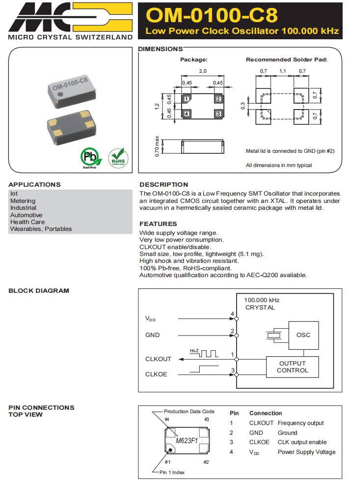 OV-0100-C7-100.000kHz-50PPM-TA-QC | Micro Crystal | 標(biāo)準(zhǔn)時(shí)鐘振蕩器 100.0 kHz +/-50 PPM -40/+85C |