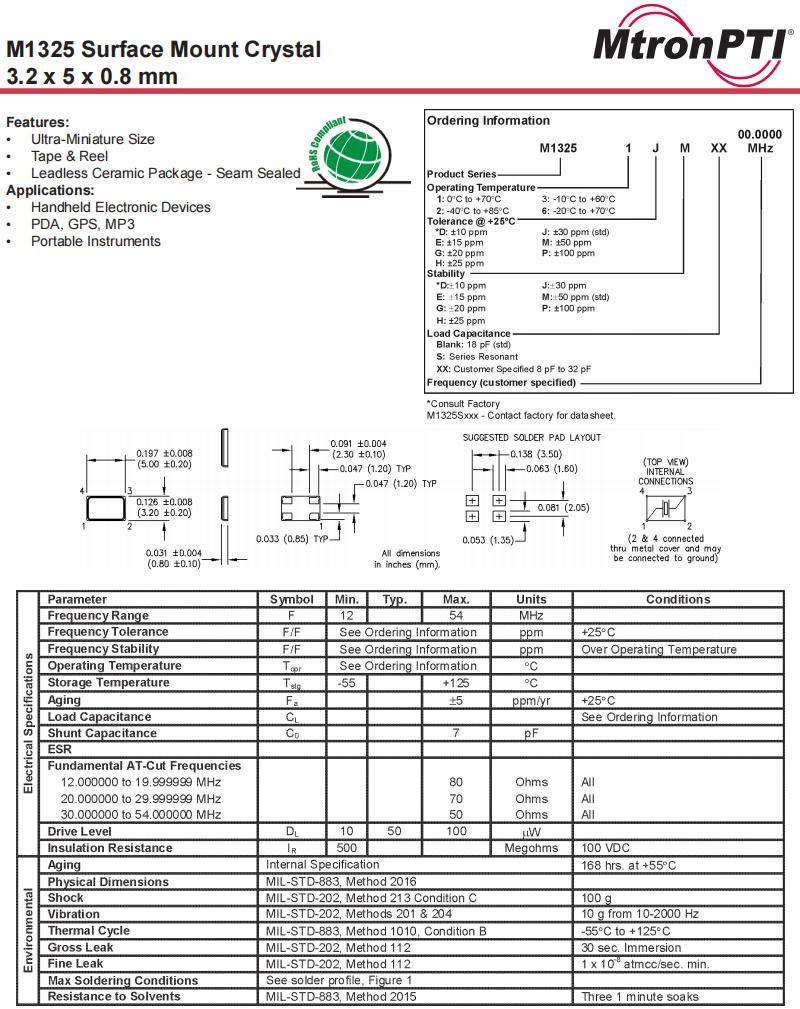 M1325S143 12.000000,MtronPTI品牌晶振,5032mm石英晶體,便攜式儀器晶振,規(guī)格表