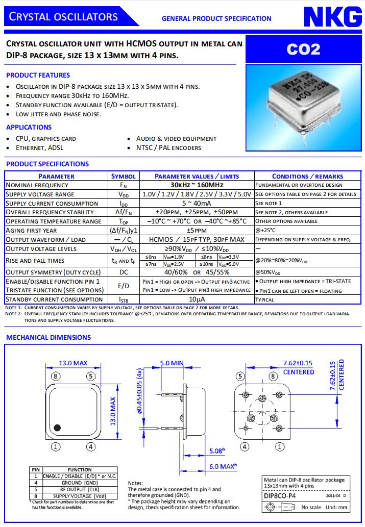 NKG Crystal|CO2-5-B-10.2400-WNS-EXT|正方形鐘振,NKG晶振,CO2正方形鐘振,進(jìn)口有源晶振,CO2-5-B-10.2400-WNS-EXT晶振,石英振蕩器,四腳插件晶振,13 x 13 x 5mm四腳插件封裝,支持待機(jī)功能,頻率10.24MHz,電壓3.3V,負(fù)載15pF,工作溫度-40~85°C,頻率穩(wěn)定性50ppm,低抖動(dòng)晶振,高品質(zhì)晶振,抗震動(dòng)晶振,專業(yè)視頻設(shè)備晶振,以太網(wǎng)晶振,CPU顯卡晶振,PAL編碼器晶振.