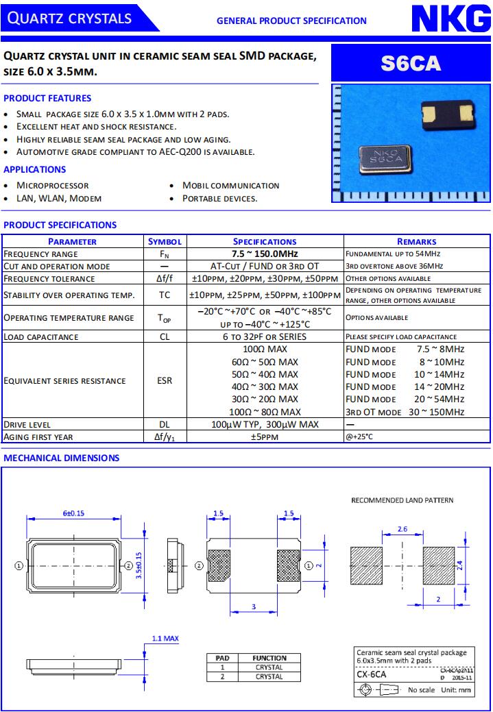 NKG Crystal|S6CA19.800F18M1Y-EXT|車(chē)規(guī)級(jí)晶振,NKG晶振,S6CA進(jìn)口晶振,石英晶振,S6CA32.000F16E23-EXT晶振,無(wú)源晶振,晶體諧振器,6035貼片晶振,二腳封裝晶振,車(chē)規(guī)級(jí)晶振,頻率19.8MHz,負(fù)載18pF,工作溫度-40~85°C,頻率容差10pm,抗震動(dòng)晶振,高精度晶振,耐高溫晶振,調(diào)制解調(diào)器晶振,移動(dòng)應(yīng)用晶振,工業(yè)自動(dòng)化晶振,數(shù)字式攝像機(jī)存儲(chǔ)晶振.