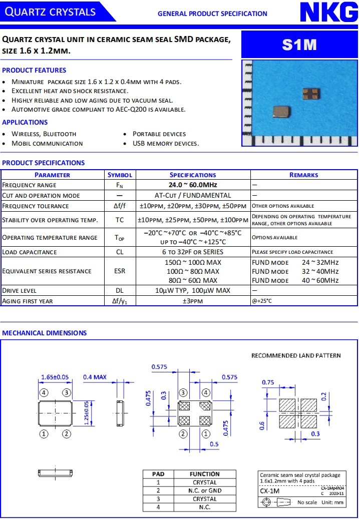 NKG晶振|S1M25.000F18E23-EXT|1612mm超小型晶振規(guī)格表