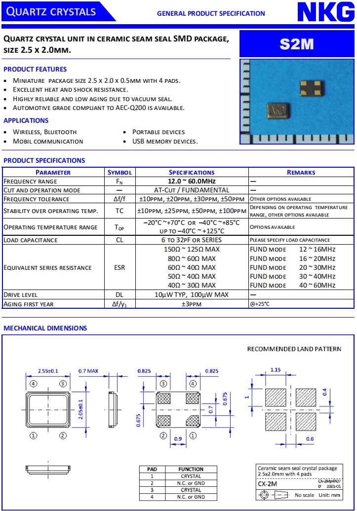 香港NKG晶體|S2M40.000F16M1Y-EXT|2520貼片晶振規(guī)格表