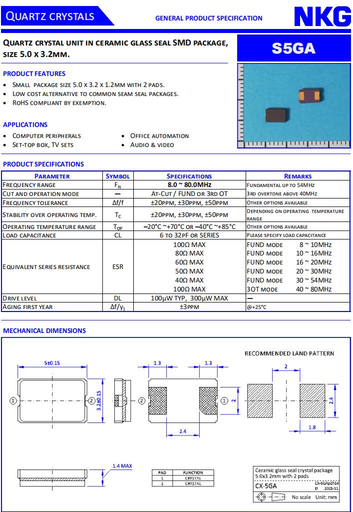 NKG晶振|S5GA38.400F18M25-EXT|5032無源晶振規(guī)格表