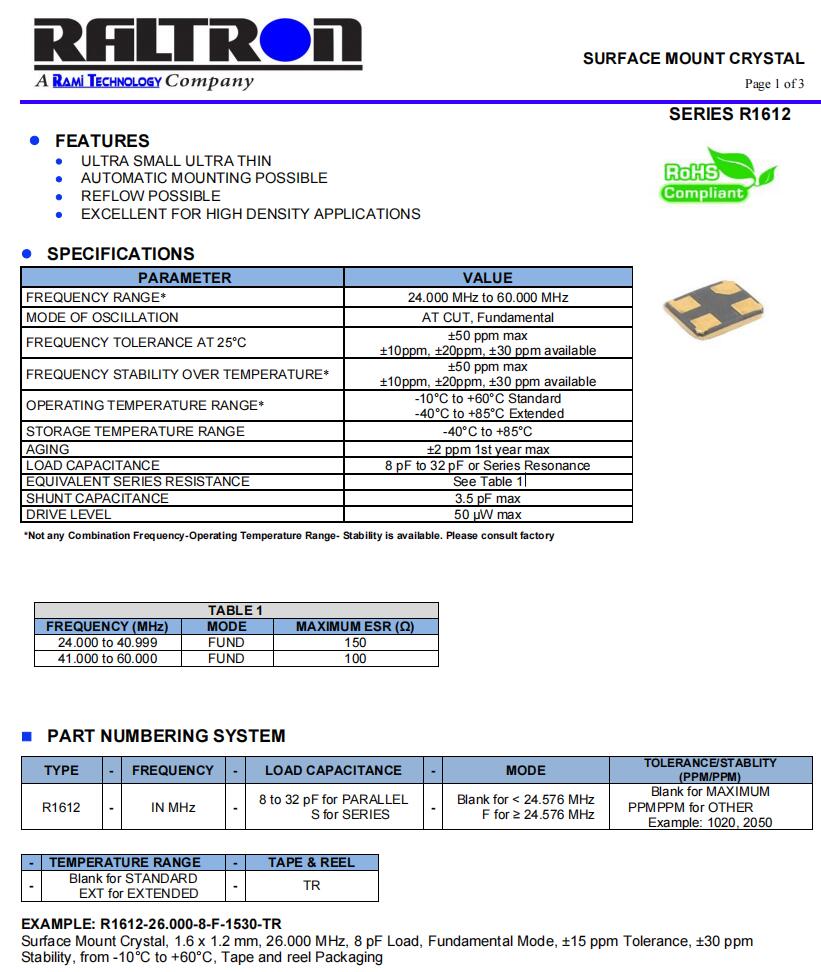 R1612-40.000-8-F-2020-TR-NS1 | R1612 | 40.000MHz | 1.6 x 1.25mm | ± 20 ppm | ± 20 ppm | 8 pf | -20°C~+70°C |