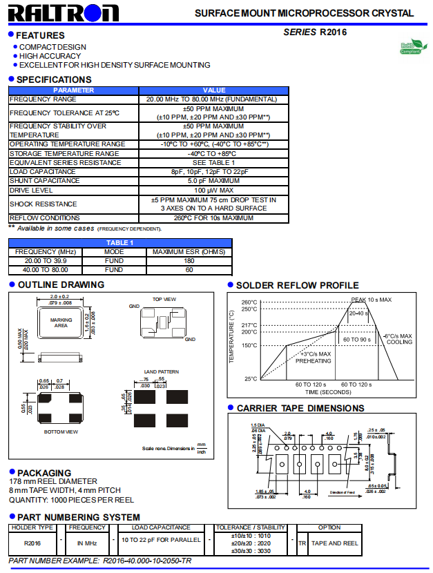 R2016-16.000-9-1010-TR-NS1 | R2016 | 16.000MHz | 2.0 x 1.6mm | ± 10 ppm | ± 10 ppm | 9 pF | -20°C~+75°C |