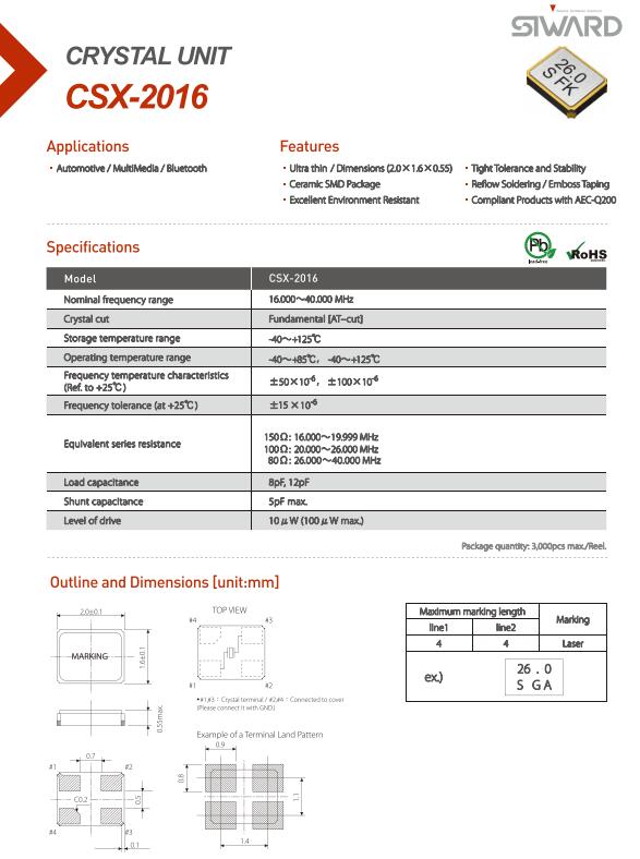 臺灣希華晶振,CSX-2016晶振,2016小體積晶振,外觀尺寸具有薄型表面貼片型石英晶體諧振器,特別適用于有小型化要求的市場領域,比如智能手機,無線藍牙,平板電腦等電子數(shù)碼產(chǎn)品.晶振本身超小型,薄型,重量輕,晶體具有優(yōu)良的耐環(huán)境特性,如耐熱性,耐沖擊性,在辦公自動化,家電相關電器領域及Bluetooth,Wireless LAN等短距離無線通信領域可發(fā)揮優(yōu)良的電氣特性,滿足無鉛焊接的回流溫度曲線要求.