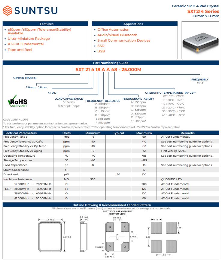 SXT21410AA16-48.000M | 2.0X1.6 SMD (4 PAD) CRYSTAL | 10pF | ±50ppm | 48.000M |