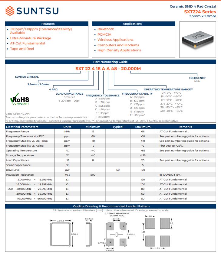 SXT22410AA07-48.000M | 2.5X2.0 SMD (4 PAD) CRYSTAL | 10pF | ±50ppm | 48.000M |