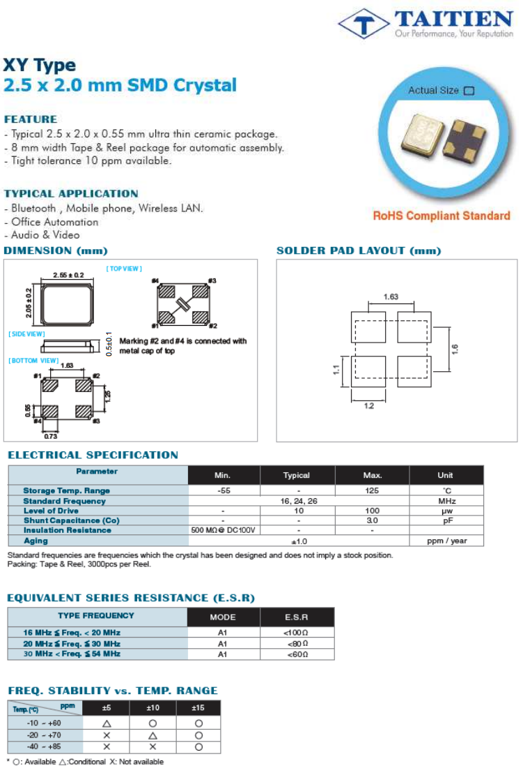 XYAEECNANF-26.000000 | Taitien | XY | 26MHz | ±30ppm | ±30ppm | 8pF |
