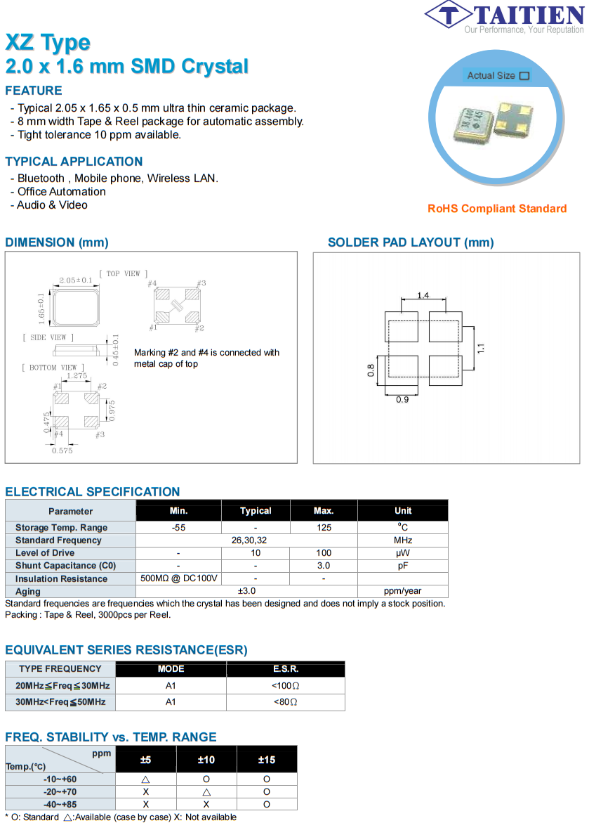 XZLEECNANF-26.000000 | Taitien | XZ | 26MHz | ±30ppm | ±30ppm | 6pF |