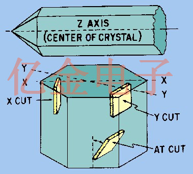 電路中使用的晶體是從天然晶體切割的薄片,并被研磨到適當(dāng)?shù)暮穸纫垣@得所需的諧振頻率.對(duì)于任何給定的晶體切割,晶體越薄,諧振頻率越高.晶體的“切割”(X,Y,AT等)意味著從天然晶體切割出可用石英晶體的精確方式.在圖2-19中可以看到一些典型的晶體切口.