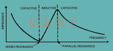 由于串聯(lián)調(diào)諧電路用作諧振點(diǎn)之上的電感器,貼片晶振晶體單元變得等效于電感器并且與等效電容器C1并聯(lián)(圖2-20的視圖(B)).在串聯(lián)諧振點(diǎn)以上的某個(gè)頻率,晶體單元將充當(dāng)并聯(lián)調(diào)諧電路.并聯(lián)調(diào)諧電路在并聯(lián)諧振頻率下具有最大阻抗,并且在并聯(lián)諧振下電感性地起作用(圖2-21).因此,在某些頻率下,取決于晶體的切割,晶體單元將用作并聯(lián)調(diào)諧電路.
