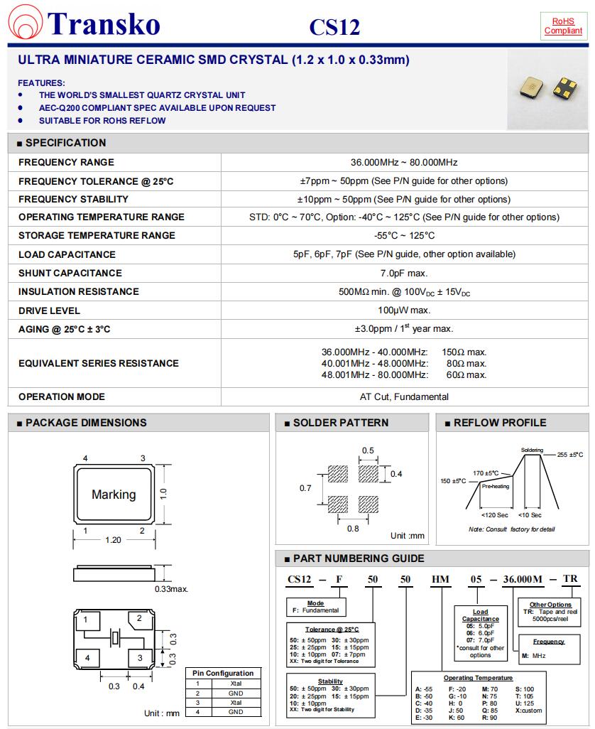 Transko晶振,CS12-F3030EQ06-40.000M-TR,6G光纖通道晶振,Transko晶振,歐美進口晶振,CS12無源晶振,石英晶體諧振器,CS12-F3030EQ06-40.000M-TR晶振,1210mm晶振,四腳貼片晶振,頻率40MHz,負載6pF,頻率公差30ppm,工作溫度-30~85°C,超小型晶振,耐高溫晶振,6G光纖通道晶振,GPS導(dǎo)航應(yīng)用晶振,通訊設(shè)備晶振,便攜式設(shè)備晶振.