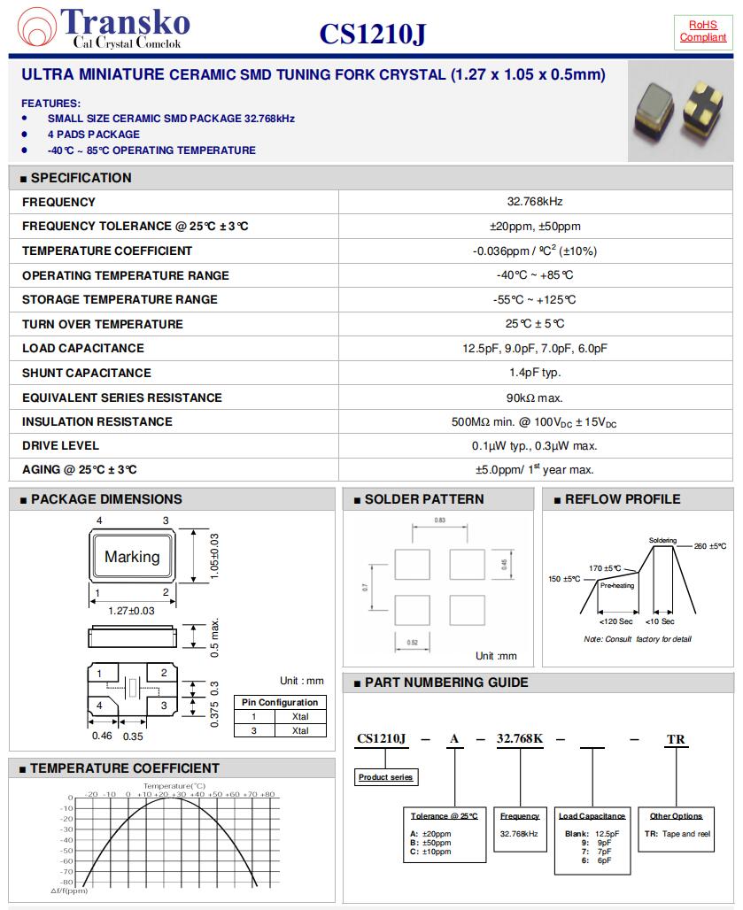 美國Transko晶振,CS1210J-A-32.768K-9-TR,車載遙控器應(yīng)用晶振規(guī)格表