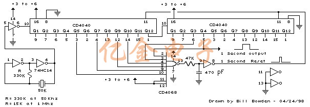 下面的示意圖說(shuō)明了將石英晶體振蕩器信號(hào)除以晶體頻率,以獲得精確的(0.01%)1秒時(shí)基.兩個(gè)級(jí)聯(lián)的12級(jí)計(jì)數(shù)器(CD4040)形成24級(jí)二進(jìn)制計(jì)數(shù)器,并且將適當(dāng)?shù)奈婚T控在一起以產(chǎn)生所需的除法.使用一些偶數(shù)倍的2的石英晶體是理想的,這樣計(jì)數(shù)器的一級(jí)自動(dòng)切換每秒,這消除了對(duì)NAND門和復(fù)位電路的需要,但是下面的電路說(shuō)明使用的晶體不是2的偶數(shù)倍.所以需要額外的組件.