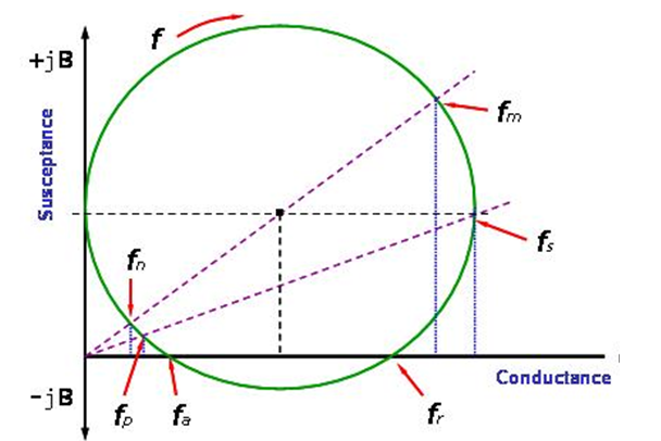 這三組頻率的導(dǎo)納(admittance)圖, 可以從(如圖)復(fù)數(shù)坐標(biāo)清楚的看到串聯(lián)偕振頻率及并聯(lián)偕振頻率, fs and fp ,是分別由電導(dǎo)(real part of the admittance)最大和阻抗(real part of the electric input impedance)最大時(shí)的頻率.諧振頻率及反諧振頻率, fr and fa , 分別是當(dāng)電導(dǎo)等于零(純電阻特性)的二個(gè)頻率. 在這個(gè)時(shí)候, fr 的阻抗為 1 / Rr 而fa 的阻抗為 1/ Ra.