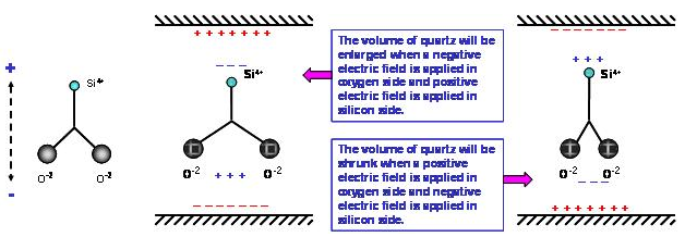 石英材料中的二氧化硅分子(SiO2) 在正常狀態(tài)下, 其電偶極是互相平衡的電中性. 在(如圖)的二氧化硅是以二維空間的簡化圖形. 當(dāng)我們在硅原子上方及氧原子下方分別給予正電場及負(fù)電場時(shí), 空間系統(tǒng)為了維持電位平衡, 兩個氧原子會相互排斥, 在氧原子下方形成一個感應(yīng)正電場區(qū)域, 同時(shí)在硅原子上方產(chǎn)生感應(yīng)負(fù)電場區(qū)域. 相反的情況, 當(dāng)我們在硅原子上方及氧原子下方分別給予負(fù)電場及正電場時(shí), 兩個氧原子會相互靠近, 氧原子下方產(chǎn)生感應(yīng)負(fù)電場,硅原子上方產(chǎn)生感應(yīng)正電場. (如圖). 然而, 氧原子的水平位置變化時(shí),迫使氧原子回到原來的空間位置. 因此, 電場的力量與原子之間的力量會相互牽動, 電場的改變與水平方向的形變是形成交互作用狀態(tài).