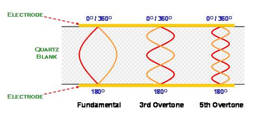 在AT切割角度的石英晶體共振子主要是以厚度剪切振蕩模態(tài)存在. 石英晶體在共振時, 除了基本波振蕩之外, 高階的倍頻共振也與基本波振蕩同時存在于石英晶體的電極區(qū)域之間. 但是, 由于壓電材料的電極是電氣相位相反的振動環(huán)境, 所以, 祇有奇數(shù)倍(odd number)的高頻倍頻可以發(fā)生, 偶數(shù)倍(even number)的倍頻共振在石英晶體共振子是不會存在的.